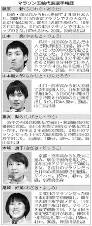 日本陸連は12日、都内で開いた理事会でロンドン五輪マラソン代表を決定した。女子は大阪優勝の重友梨佐(天満屋、24)、横浜優勝の木崎良子(ダイハツ、26)と11日の名古屋で2位に入った尾崎好美(第一生命、30)、男子は東京で日本勢4季ぶりの2時間7分台をマークした藤原新(東京陸協、30)とびわ湖4位の山本亮(佐川急便、27)、同5位の中本健太郎(安川電機、29)。公務員ランナーとして注目された川内優輝(埼玉県庁)は選ばれなかった。
