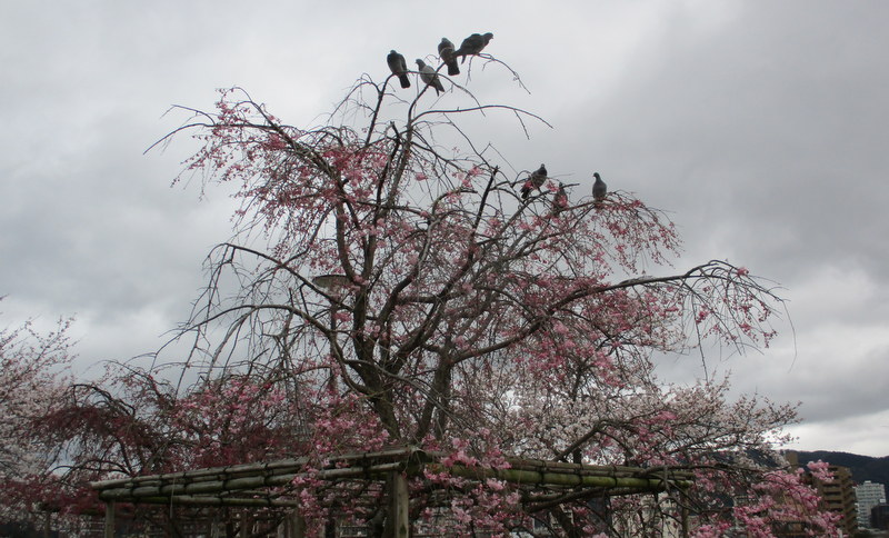 4月1日唐橋公園のベニシダレ-鳩も花見