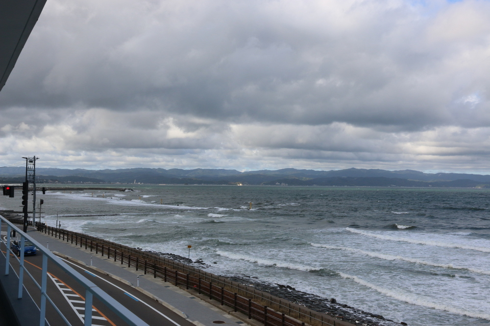 荒波の向こうは能登半島の氷見市
