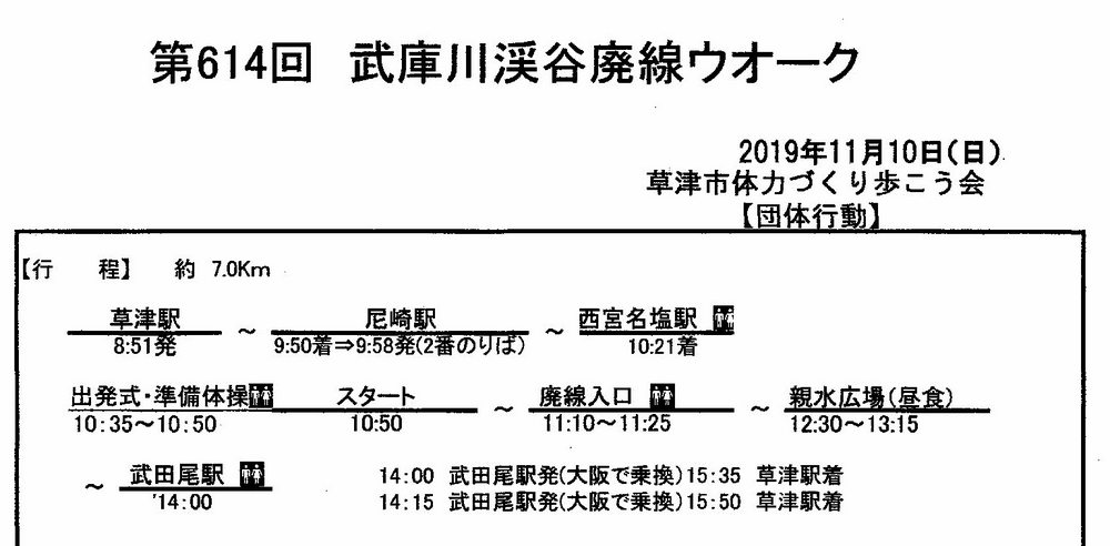 | 草津市歩こう会 第614回 武庫川渓谷廃線敷ウオーク 歩行距離 7キロ 参加者:82名+スタッフ19名 天気:晴れ 最高気温 18℃ |