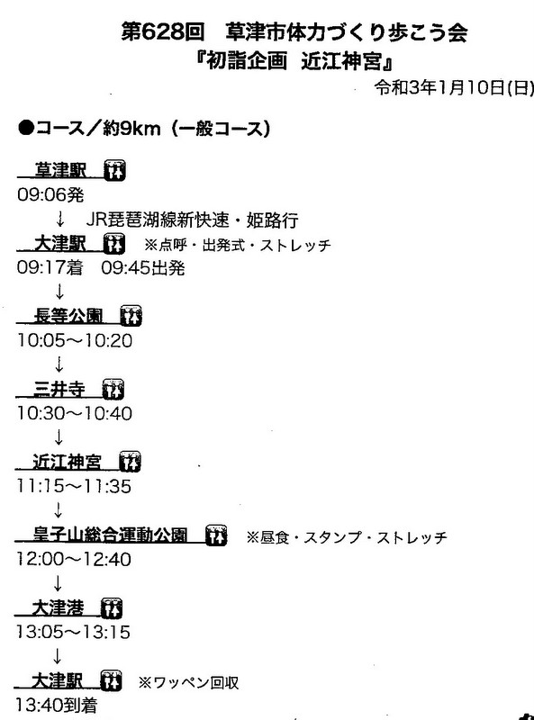| 大津市内 中止の草津市歩こう会コース 新型コロナウィルス感染防止で残念ですが中止となりました。 折角作ってもらった弁当と係の人にもらったコースマップで10キロ歩きました。 1月10日(日) 大津市内から近江神宮の初詣 天気:晴れ 最高気温6℃ |
