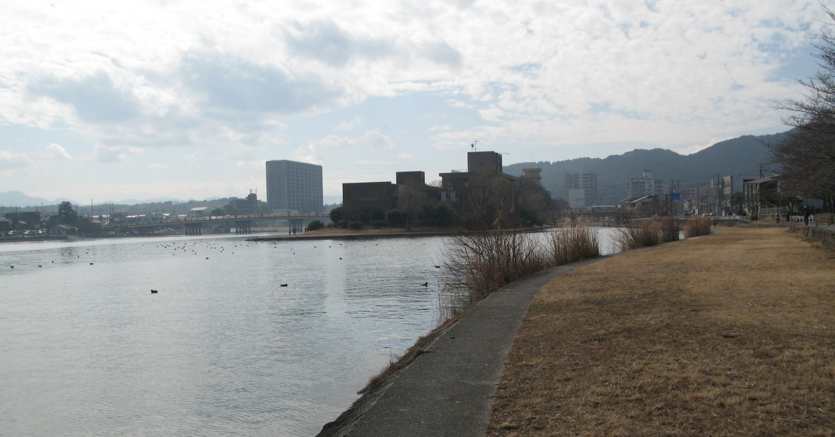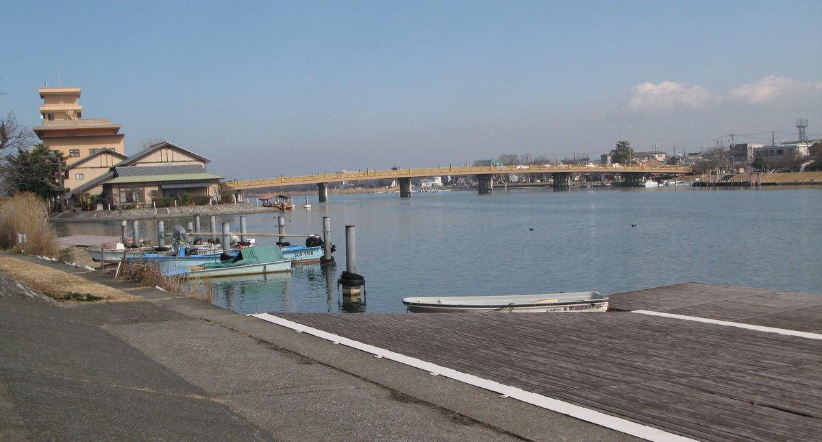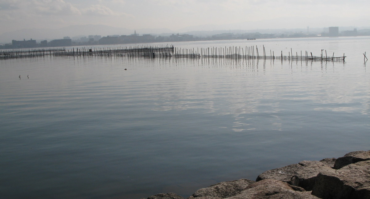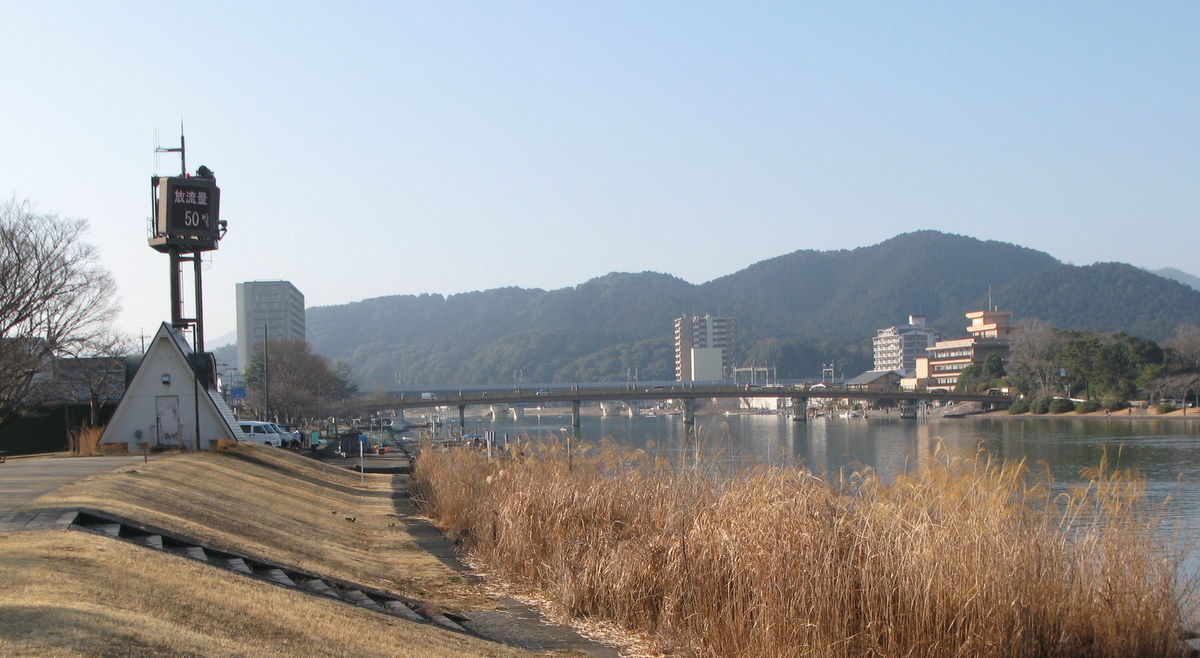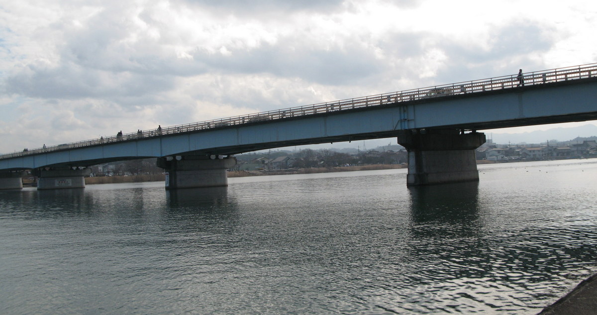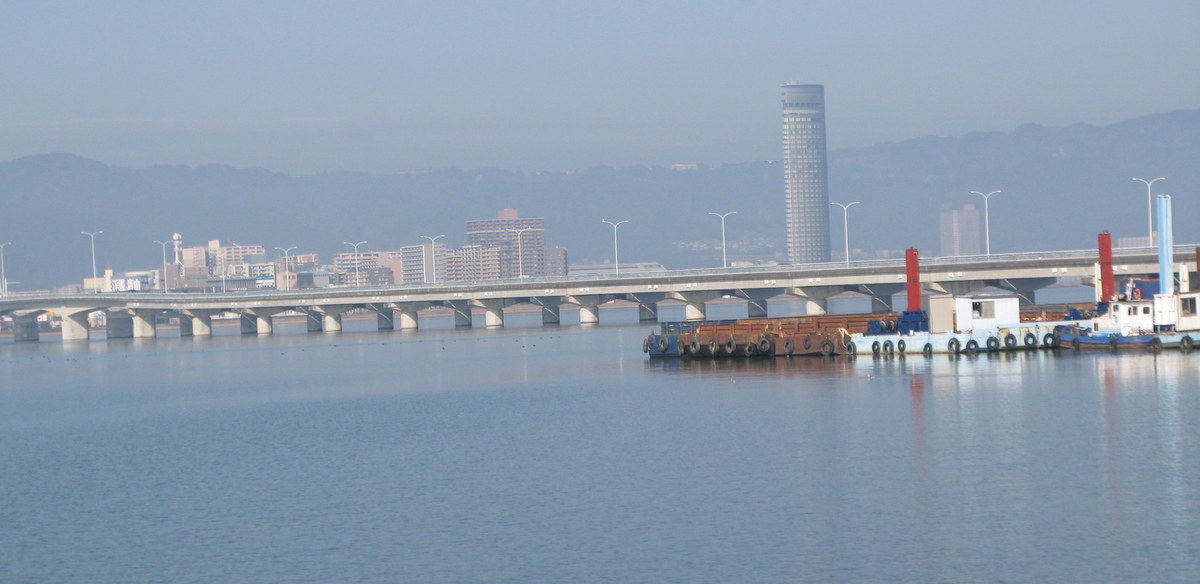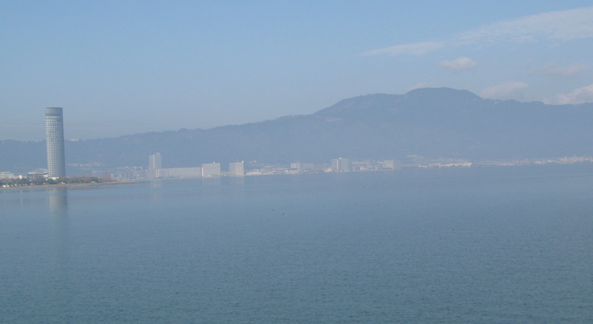 | 近江大橋から春霞の比叡山とプリンスホテル |