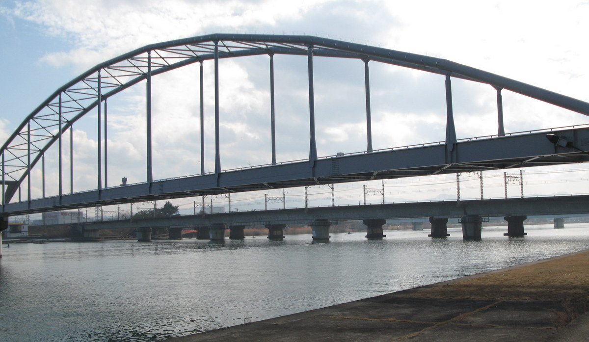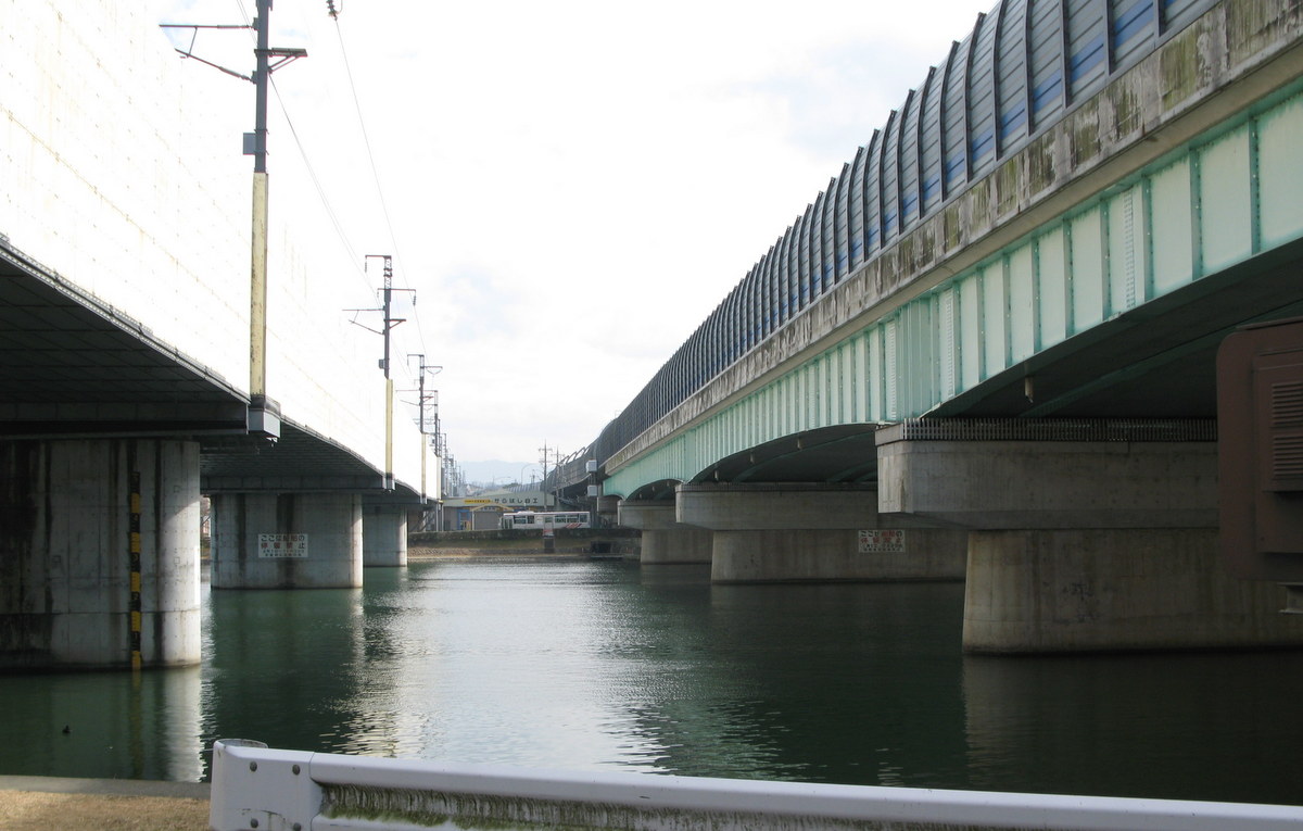 | 新幹線鉄橋(左)と名神高速道路鉄橋 一部南側コースを歩く |