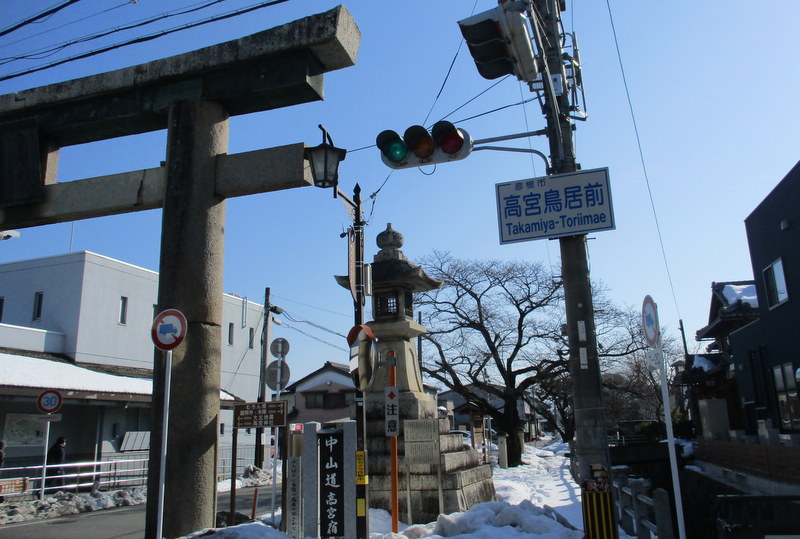 | 高宮鳥居前(鳥居の下にある句碑:道ばたに多賀の鳥居の寒さかなー尚白) |