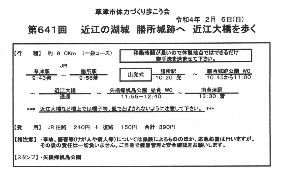 | 第641回 草津市体力づくり歩こう会 2月6日(日)「膳所城址公園~矢橋帰帆島」 晴れ時々曇り 気温 MAX5℃ 参加者 29名+スタッフ17名 |