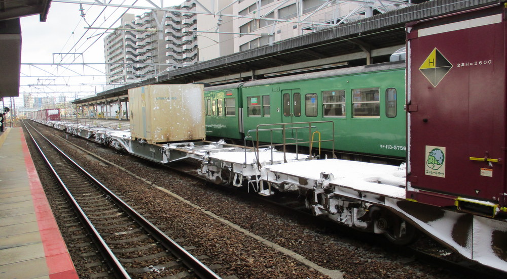 | 前日の大雪で貨物列車は真っ白(集合の草津駅にて) |