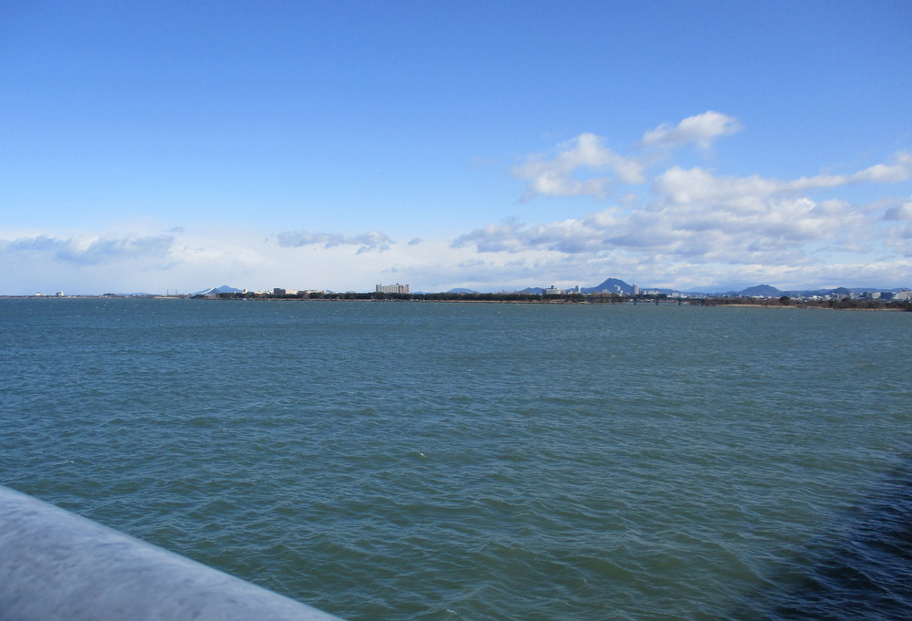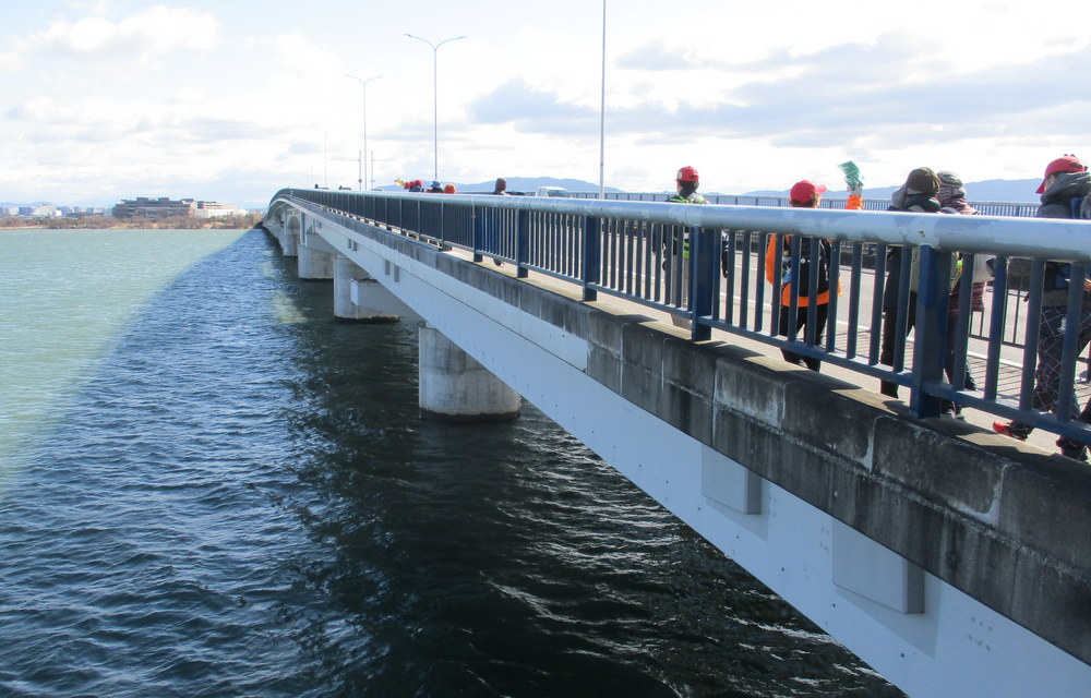 | 近江大橋を渡る(強風で帽子を押さえて) |