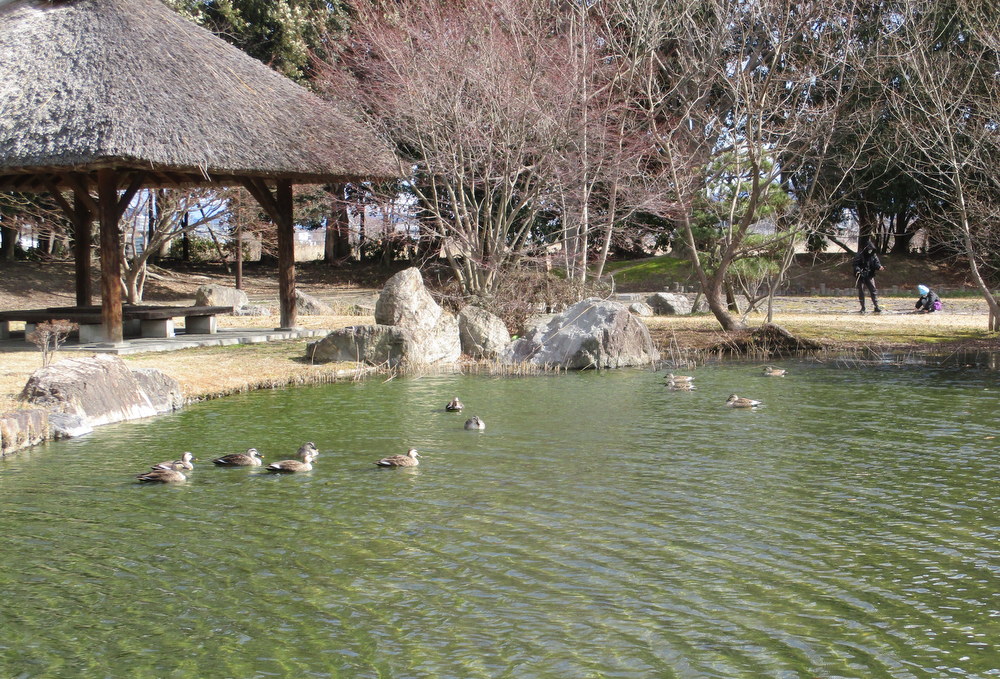 | 矢橋帰帆島の公園で昼食(池には一部氷が) |
