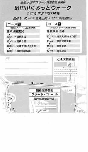 | 大津市スポーツ推進委員協議会 2月27日(日)「瀬田川ぐるっとウォーク」 当日は大阪で 第10回大阪マラソン・ 第77回びわ湖毎日マラソン統合大会が9時15分から開催されて、初めての同日ウォークでした曇り時々晴れ 気温 MAX9℃ 参加者 約100名~130名 |